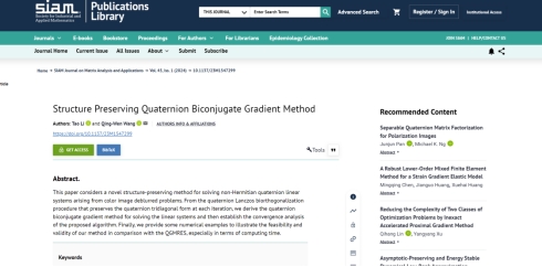 近日,yl6809永利官网李涛博士以第一作者署名的文章“Structure Preserving Biconjugate Gradient Method”在国际数值代数领域权威期刊《SIAM Journal on Matrix Analysis and Applications》正式发表,文章链接https://doi.org/10.1137/23M1547299。