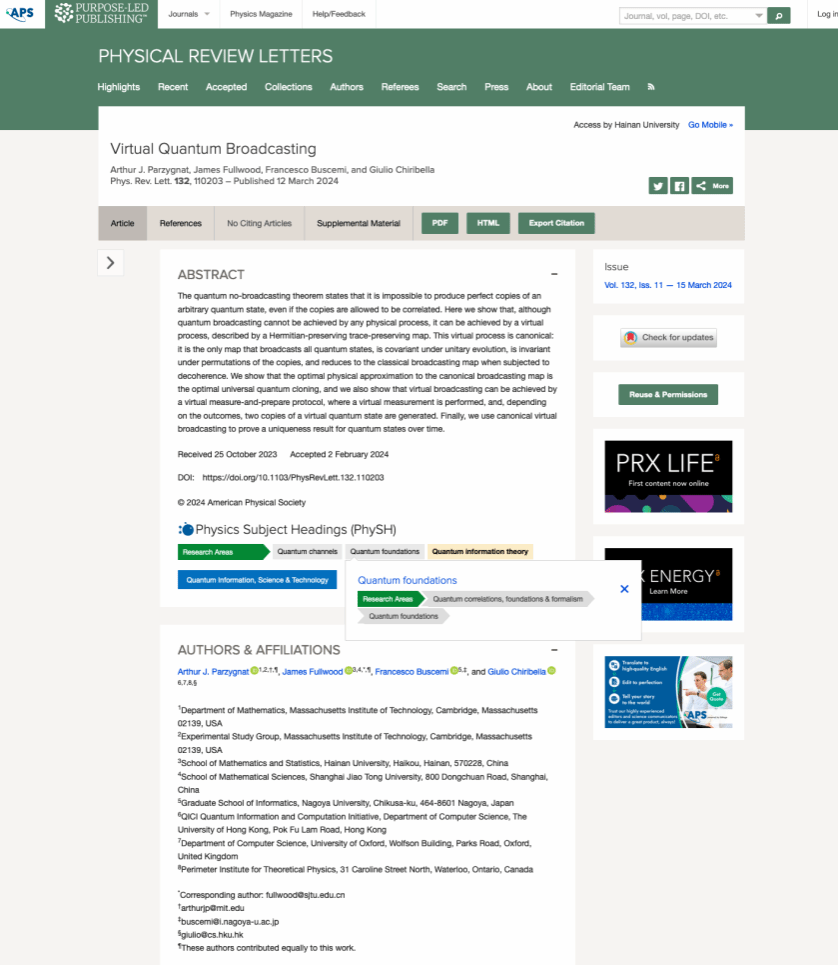 近日,yl6809永利官网教师James Fullwood以通讯作者及共同第一作者在权威期刊《PHYSICAL REVIEW LETTERS》合作发表了题为“Virtual Quantum Broadcasting”的学术论文。合作者为麻省理工学院Arthur J. Parzygnat教授、名古屋大学Francesco Buscemi教授和香港大学Giulio Chiribella教授。