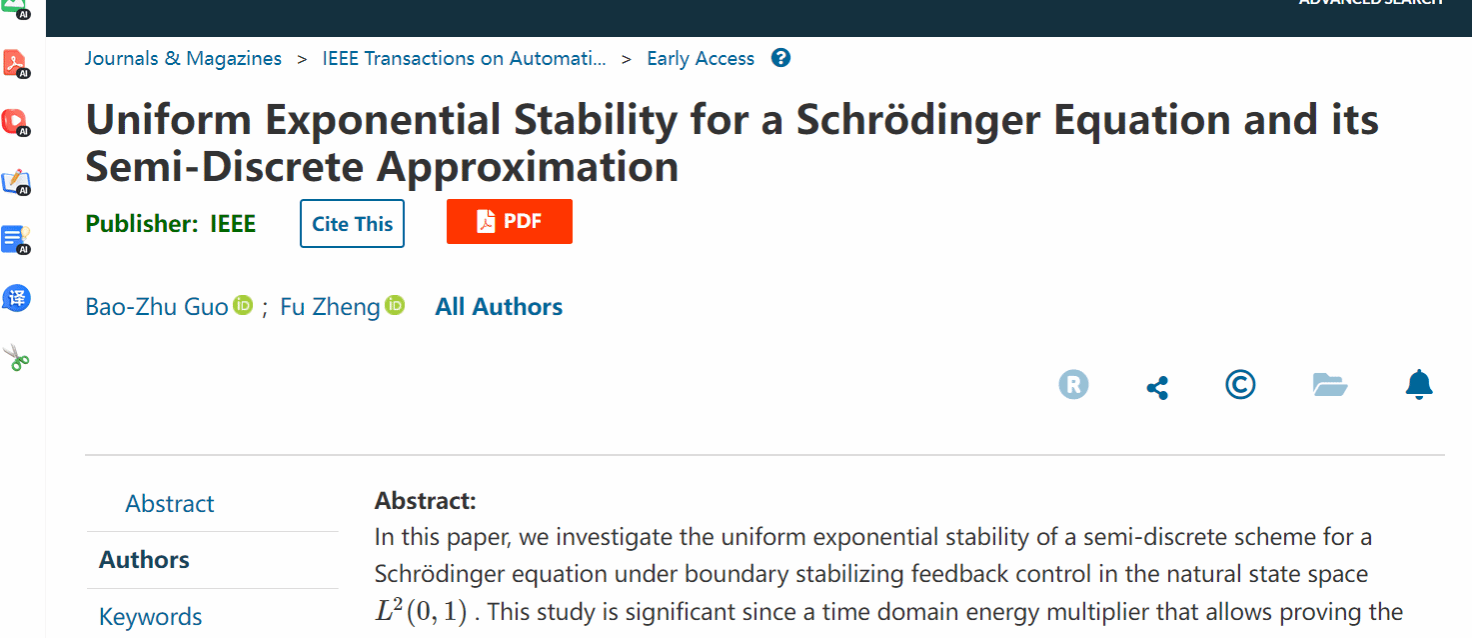 近日,yl6809永利官网郑福教授以唯一通讯作者署名的文章“Uniform Exponential Stability for a Schrödinger Equation and its Semi-Discrete Approximation”在控制论领域权威期刊《IEEE Transactions on Automatic Control》在线发表,论文合作者是中国科学院数学与系统科学研究院系统控制重点实验室郭宝珠研究员。