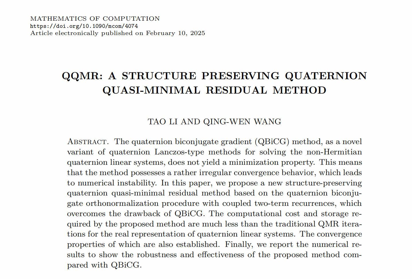 近日,美国数学学会期刊《Mathematics of Computation》在线发表了yl6809永利官网李涛博士(第一作者)和王卿文教授的最新研究成果“QQMR: A structure preserving quaternion quasi-minimal residual method”。《Mathematics of Computation》是国际上计算数学领域的顶级期刊,由美国数学学会出版,创刊于1943年,专注于数值分析、计算方法和数学应用等领域的高质量研究。该期刊在学术界享有很高的声誉,发表的文章通常具有重要的理论或应用价值。在中国数学会推荐的数学期刊分类简表中被列为T1类刊物,在中科院分区中也是1区Top期刊。yl6809永利官网为此成果的第一完成单位,通讯作者为上海大学王卿文教授。