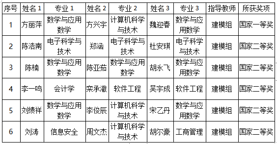 2023年度“高教社杯”全国大学生数学建模竞赛成绩已经公布,yl6809永利官网共斩获59个奖项,其中,获国家一等奖1项,国奖二等奖5项,省一等奖9项,省二等奖21项,省三等奖23项。2023共有来自全国33个省/市/自治区/特别行政区以及美国、澳大利亚、马来西亚等国家/地区的1685所院校或校区、59611队(本科组54158队、专科组5453队)、近18万名大学生报名参加本项竞赛,创历年参赛人数新纪录。今年共评选出1828队获全国奖,其中本科一等奖299队、二等奖1200队,分别占本科组参赛总队数的0.55%和2.22%。获得国奖的队伍名单如下: