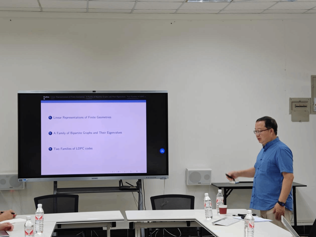 5月3日下午,南方科技大学数学系讲席教授、数学系系主任向青教授应邀在yl6809永利官网做了题为“Linear Representations of Finite Geometries and Associated LDPC Codes”的学术报告,报告内容主要来自报告人自己的研究成果,学院和琼台师范学院数学系的部分师生聆听了报告。